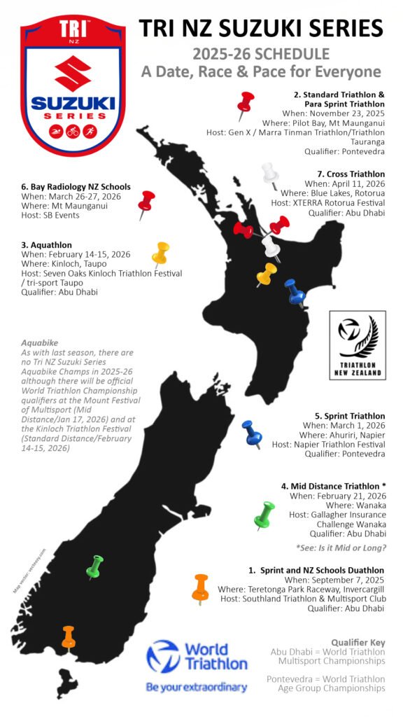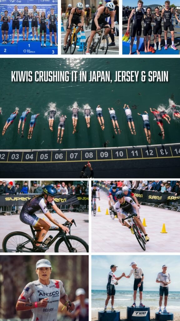🥝 TASTE OF KIWI: The weekend that was for New Zealand triathletes around the globe was indeed a good one. (Top, from L to R): Saxon Morgan and Henry McMecking claim silver and bronze at Asia Cup Gamagori; The pair go pedal stroke for pedal stroke in the sprint; silver the next day for the NZL relay quartet of Grayson Westgate, Phoebe Carter, Amara Rae and James Corbett in Japan; Supertri Jersey start; Nicole van der Kaay sadly crashed on the bike early en route to being eliminated but it was good to be back; Tayler Reid also crashed at the same slippery roundabout but recovered to hold on to 5th; Hannah Berry ran to 6th at T100 Oropesa del Mar; Hayden Wilde made it a perfect 4 from 4 in Spain to go top of the men’s standings.