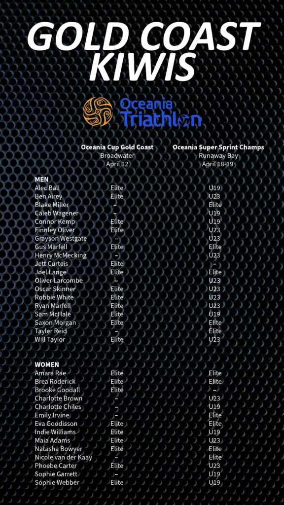Most of the 22-strong Kiwi contingent are racing both weekends. For the U23 and U19 athletes in the group, Broadwater means an open elite field test this weekend to sharpen themselves before contesting their own age specific categories at the Oceania Super Sprint Championships next week.