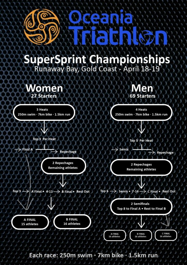 Every race at the Oceania SuperSprint Championships is contested over the same course: a 250-metre swim in the Gold Coast Performance Centre’s outdoor pool swim, a 7km bike leg around the outskirts of the facility and a 1.5km run on the central athletics track. But the road to the final looks different depending on whether you’re racing in the women’s or men’s field